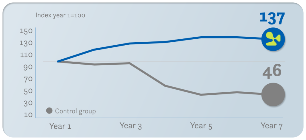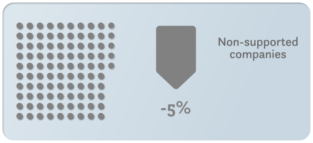 Mitacs-supported enterprises are creating jobs and growing their workforce. They experienced a steady increase of 18 percent in employment levels over seven years. Non-supported companies presented a downward trend, with a reduction of 5 percent of their workforce in the same period.