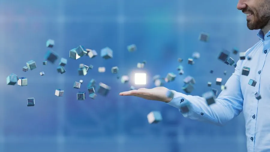 Businessman with flying cubes, while the closer cube to his hand is lightning up. Concept of access to business resources
