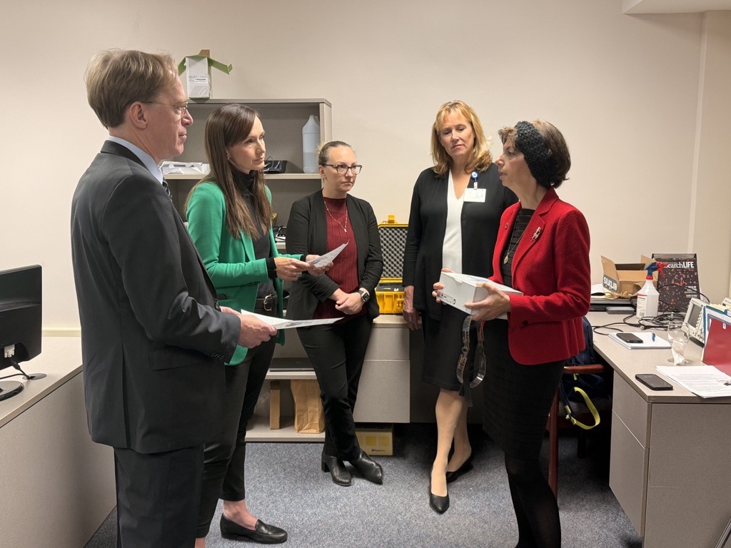 Winnipeg, MB — The Honourable Renée Cable, Manitoba’s Minister of Advanced Education and Training, joined Mitacs at the R&D labs at Riverview Health Centre (RHC) to review some of the ground-breaking innovation underway in the province.